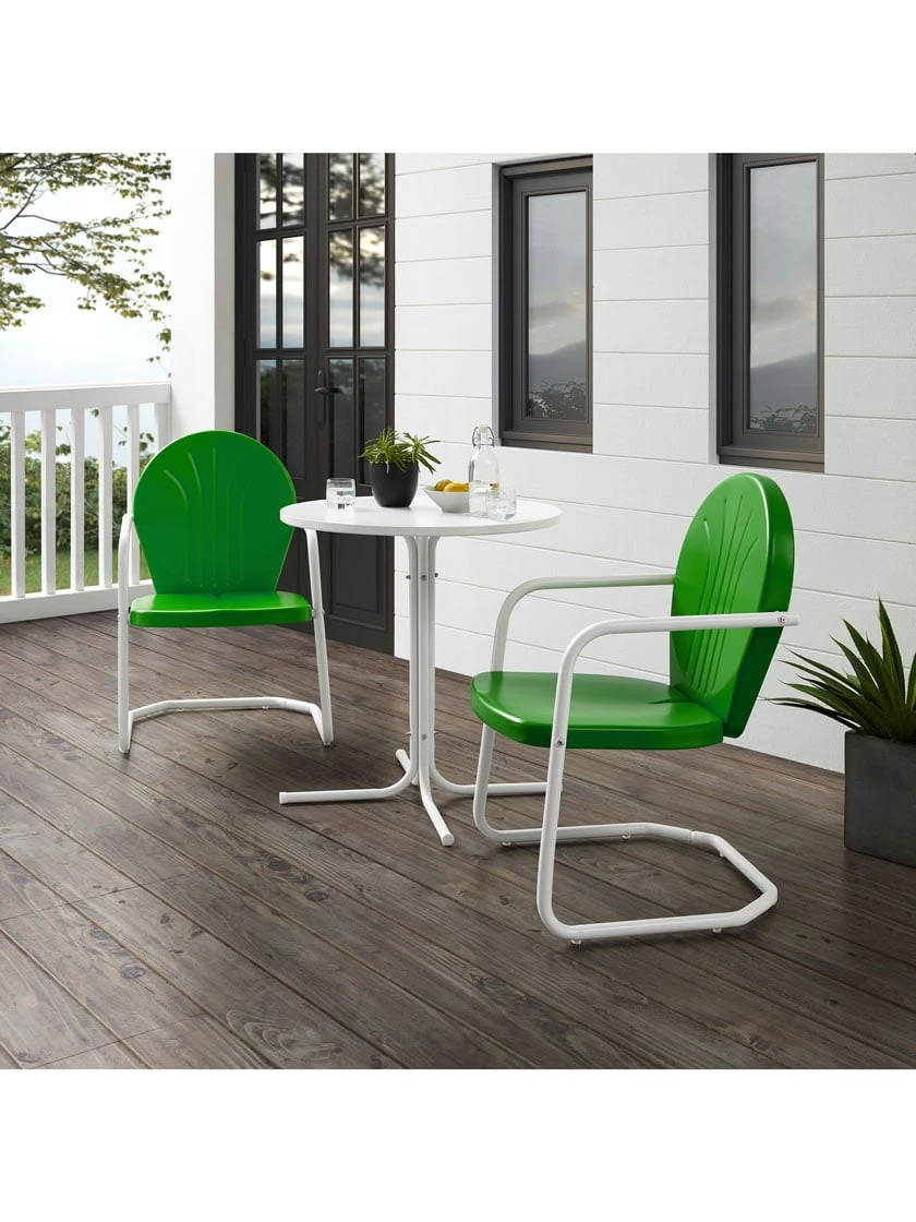 Add retro simplicity and function to your outdoor retreat with the Griffith 3pc Bistro Set. Featuring a powder-coated finish over durable steel, the bistro table partners with two classic Griffith Chairs. Each chair has a vintage style that comes in a variety of vibrant colors and offers a cantilever base with just enough flex for lounging in comfort. The table has a sturdy pedestal base that easily tucks between the chairs, making the Griffith 3pc Bistro Set ideal for a small balcony or patio.