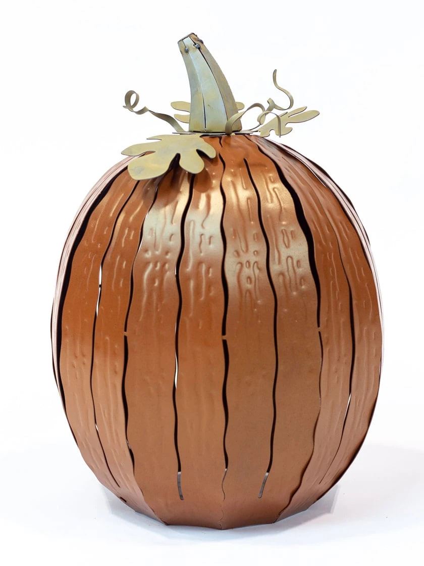 Let this striking Pumpkin Luminary be the center of attention throughout the season. Place a light or a candle beneath it to see the glowing striations and add warmth to those autumn evenings. This maintenance free adornment is perfect for any walkway or patio. Powder-coated steel construction for all-weather, rust-proof, and fade-resistant durability. For indoor or outdoor use. There is a large 6” opening for a candle or light placement (candle/light not included). Use a flameless candle or 3-wick jar candle for best results.
