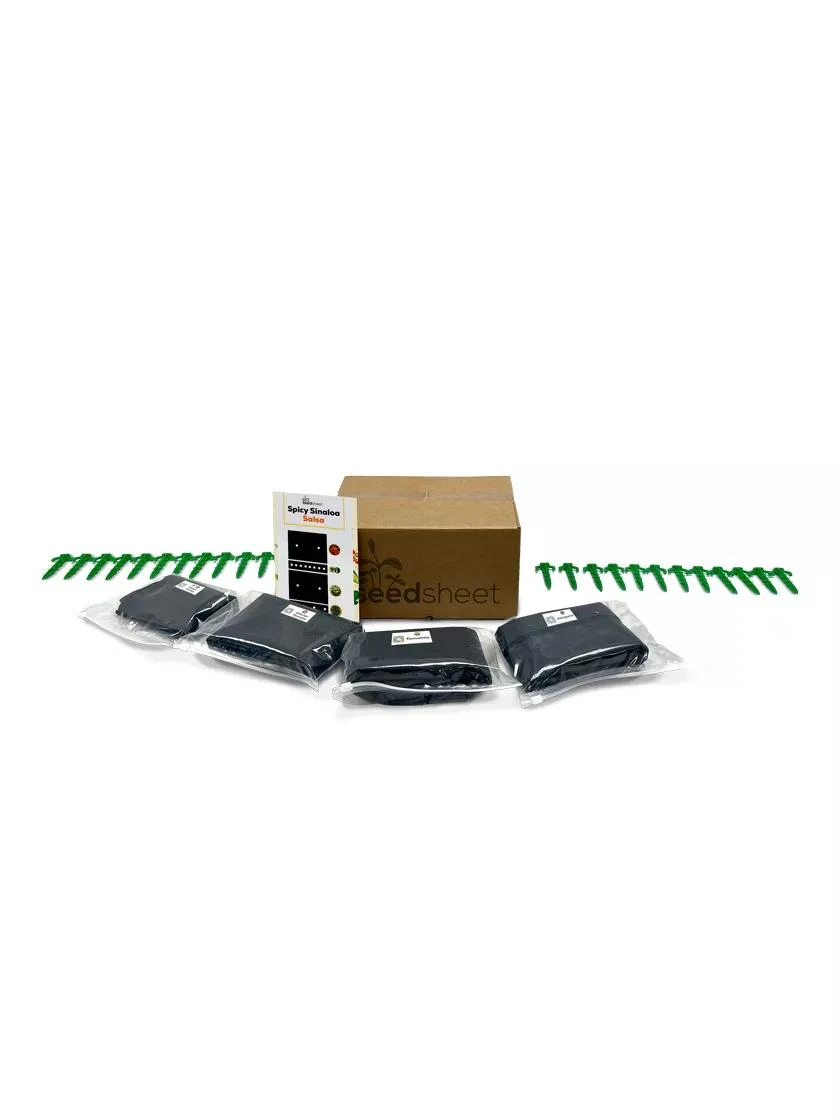 The dissolvable seed pouches are made out of a food-safe polyvinyl alcohol film, most commonly used in gel casings for pills. The permeable weed-blocking fabric keeps weeds at bay without harmful chemicals, and allows for water and air exchange. While sheets arrive in set dimensions, you can easily cut to desired size (just be careful not to cut into seed pouches). Included stakes help to anchor each SeedSheet.